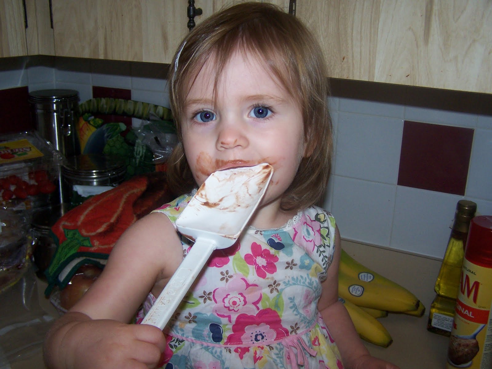 Eating(Stuffing her face) her favorite food in the world. She'd eat them all day long if we let her. As a special once a week treat at school, she gets a chocolate covered "manana". She inhales it so we've been told. :)